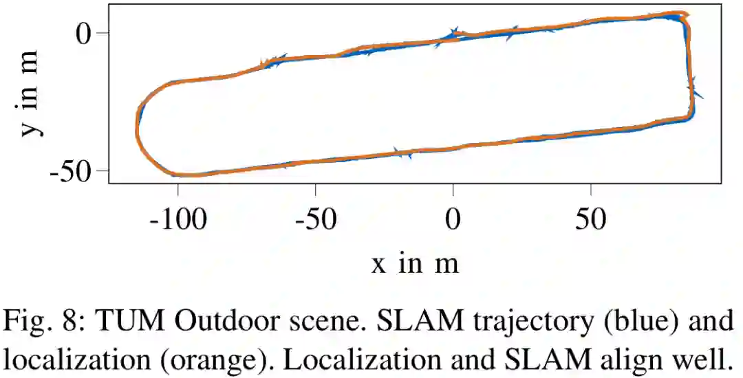 图8 : TUM数据集户外场景。SLAM轨迹(蓝色)和定位(橙色)。定位和SLAM轨迹相近