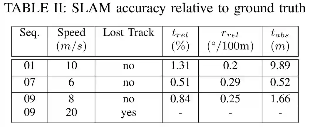 此系统的定位能力在特征值较少的环境中表现并不好,比如KITTI的01序列。这对类似算法在特征相似的比赛场景中的应用提出了挑战。(针对这个问题,)许多新兴的方法使用深度学习技术生成的特征来提高SLAM的应用性。尽管这种方法是否能提高上述场景的定位精度仍是一个有待研究的问题。同时,与目前(主流)的视觉特征相比,这些深度特征可以在光照条件改变时发生更小的变化。这可以使地图的重定位功能在不同的场景条件下比如白天和晚上,依然能够实现。