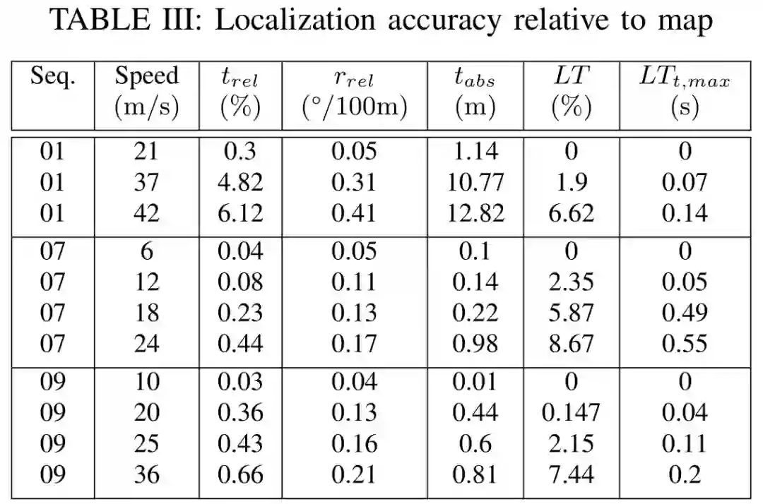 我们使用KITTI数据集的场景来评估已建成SLAM地图的定位精度。此外,我们用自己的小型电动模型车记录的数据对构建的地图进行了定位精度测试。测试结果表明,在特征丰富的环境中,对于直线速度平均为36 m/s行驶的车辆而言,定位的相对平移误差可以保持在1%以下。与完全SLAM相比,该定位模式拥有更好的定位精度和更低的计算负荷。我们对ORB-SLAM2拓展的源代码将在以下网址公开:https://github.com/TUMFTM/orbslam map-saving-extension