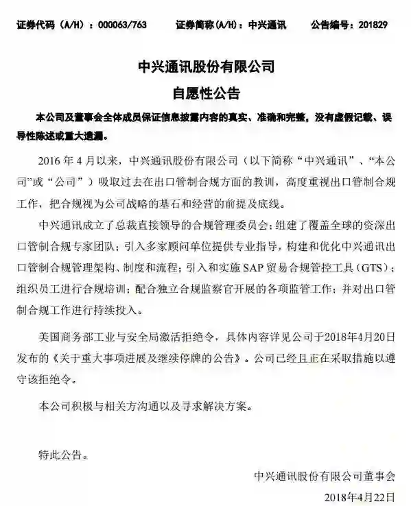 中兴通讯发布自愿性公告:正在采取措施以遵守拒绝令