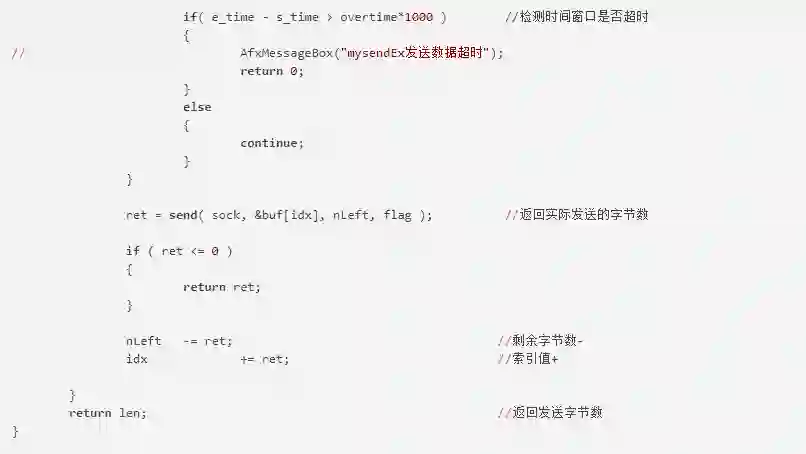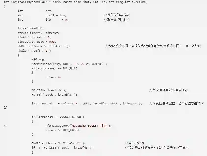 mysend函数用来发送指定的套接字数据。sock为指定的Socket。buf为用来存放要发送的数据的缓冲区。len为待发送数据的长度。flag一般设置为0。overtime为超时时间。这里采用了select机制防止I/O操作阻塞,提高了程序运行效率。这里要注意每次执行select操作之前都要更新文件描述符,因为select操作会更改文件描述符。