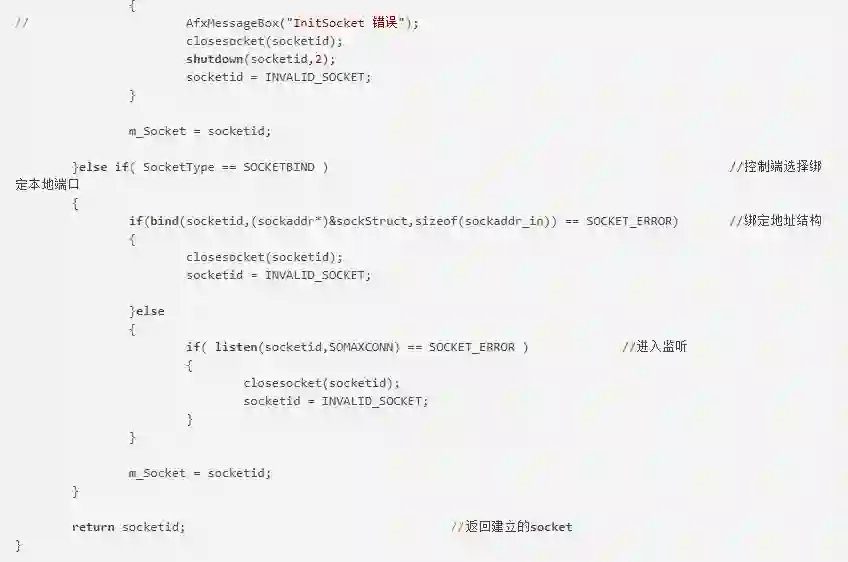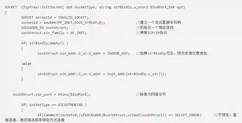 InitSocket参数解释如下,SocketType为连接类型,当值为 SOCKET_BIND时表示绑定本地端口,服务器监听端口等待客户端来连接,当值为SOCKET_NOBIND时表示不绑定,服务端主动连接客户端。strBindIp为要绑定的IP地址,””(空)为本地任意地址,这样做的目的是当服务器有多块网卡时,不论哪个网段上的客户程序都能与服务器通信。uBindPort为要绑定的端口。