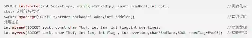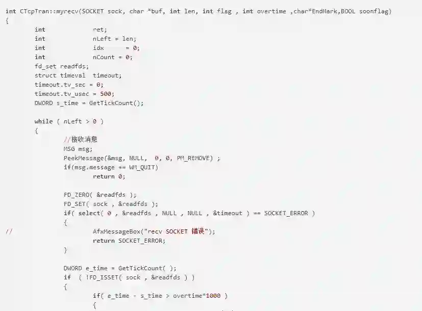 myrecv函数用来接收指定的套接字数据。sock为接收端套接字描述符。buf 用来存放接收到的数据的缓冲区。len为接收数据的缓冲区的大小。flag一般设置为0。overtime为超时时间。endmark为结束标记。soonflag为是否立即返回结果,默认为否。与mysend函数一样采用select机制防止I/O操作阻塞。