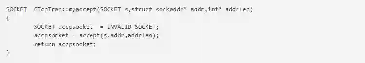 服务器接收客户端的连接请求,创建一个新的套接字和参数addr指定的客户端套接字建立连接通道。s表示处于监听状态的流套接字。addr表示新创建的套接字地址结构。addrlen表示新创建套接字的地址结构的长度。