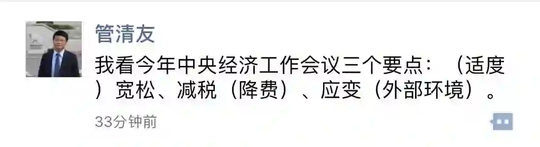 经济学家 管清友 在朋友圈点评中央经济工作会议:宽松、减税、应变。