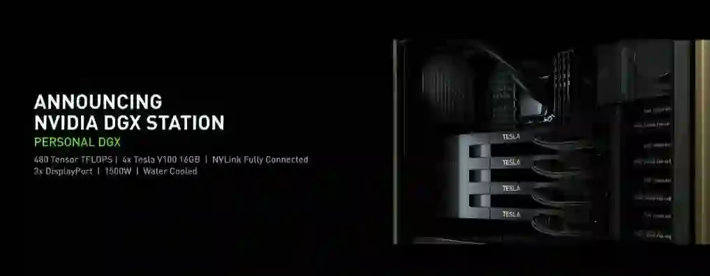 另外,还有一个小版本的DGX-1,称为 DGX站。“你可以把它当成是个人用的,非常安静。我们每个深度学习工程师都有一个。”黄仁勋说,“它配备有4个 Tesla V100。价格是69000美元。 Q3就出货。