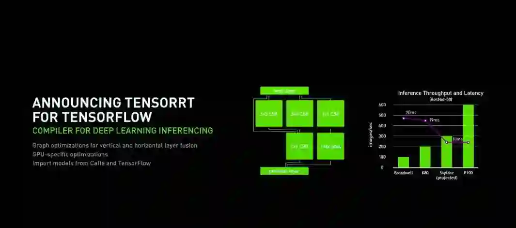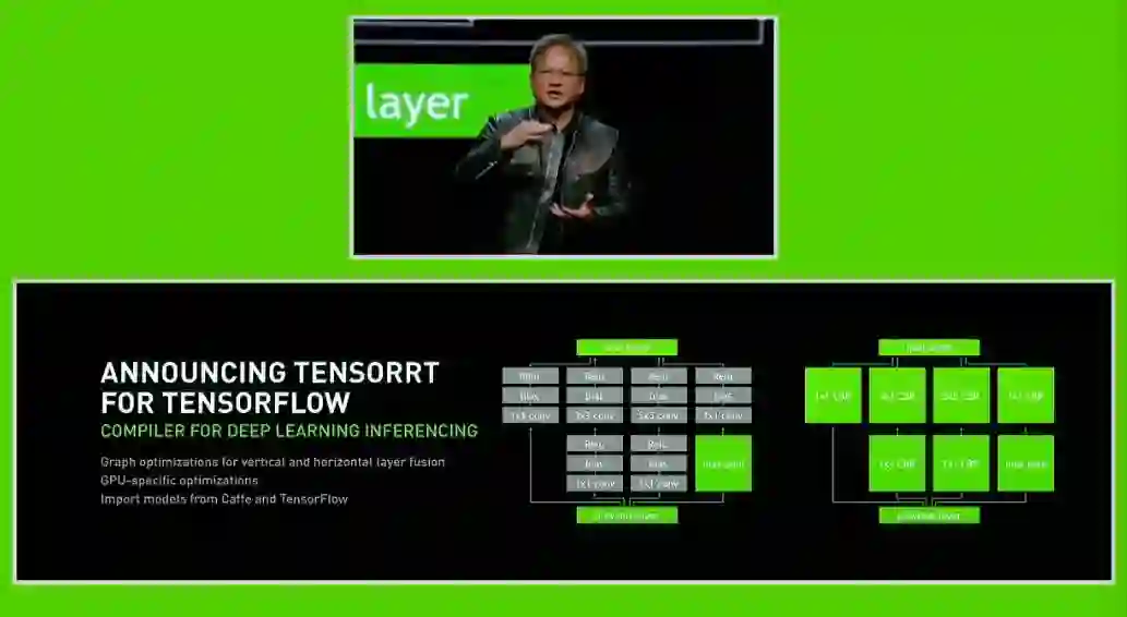 黄仁勋宣布了面向TensorFlow 的 TensorRT (RT 指运行时间)。 它使训练加速了12倍,推理加速了 6倍的。 (张量——黄仁勋指出——是一个包含向量的数学对象。)