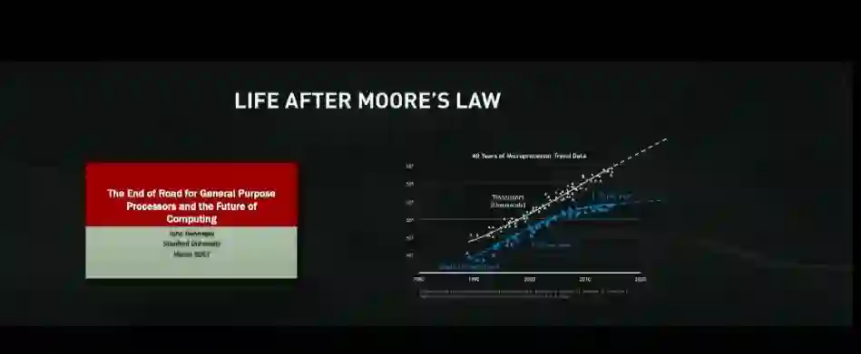 黄仁勋的主旨演讲从摩尔定律讲起。他说,在过去30年中,我们从一股强大的力量中受益良多:摩尔定律使我们能够一年又一年地推进微处理架构。此外,Dennard扩展规律也让我们能够将更多的晶体管放置在一个区域。我们将微处理器性能提高了一百万倍。社会上几乎没有什么事情的进步会比这更快。但是,物理学的规律正在追赶着我们。我们现在在两条路的尽头。