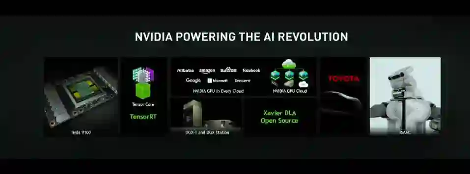 【新智元导读】英伟达CEO黄仁勋一年一度的GTC主旨演讲凌晨结束,新智元第一时间带来了深度报道(带PPT的)。本次大会最受关注的是,英伟达发布了新一代的GPU,涉及不少新的技术,比如tensor。此外, 还有“面向TensorFlow 的TensorRT”、“英伟达GPU云”“AI 研究基础设施DGX-1和DGX Station”、“开源 Xavier DLA ” 等等。黄仁勋从摩尔定律走向消亡谈起,一直说到深度学习的大爆炸。一起来看看股票涨幅“不可阻挡”的英伟达都有哪些布局。
