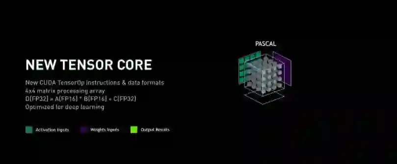 新款Tensor Core是4×4矩阵阵列。它完全针对深度学习进行了优化。 我们觉得 Pascal 还不够快。新的 Tensor Cole 比Pascal晚了一年,但是它的张量运算速度却是 Pascal 的12倍,推理能力则提升了 6倍。