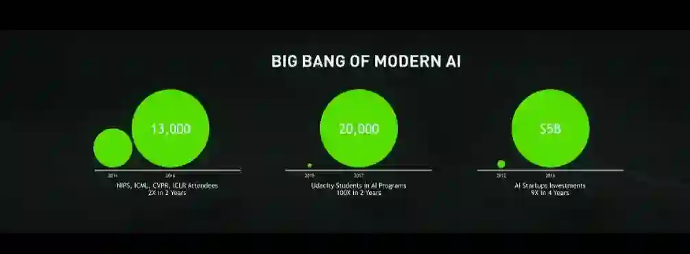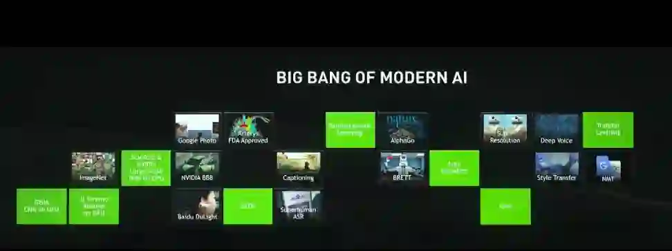 黄仁勋说,瑞士、加拿大、美国等全世界的实验室在深度学习上的丰硕成果,让大家一起进入了一个深度学习大爆炸(Big Bang of Deep Learning)的时代。