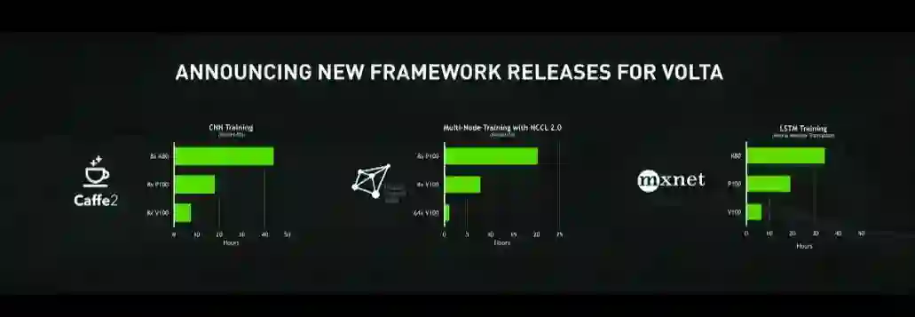 会上,黄仁勋还宣布了为VOLTA 推出的新深度学习框架,其中包括Caffe2、Microsoft Cognitive Toolkit,MXnet。 使用Caff2来训练一个卷积神经网络,在8 k80s上需要花费40小时,在Pascals上需要花费20个小时,在8 Voltas上只需5小时。黄仁勋对MxNet的评价是:“难以置信地受欢迎”。