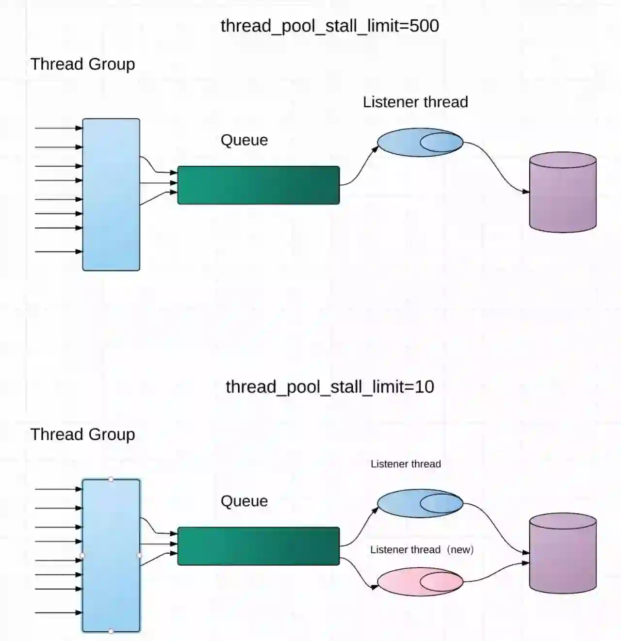 假设上文提到的由“ACTIVE”转化为“WAITING”状态的线程(标记为“线程A”)所执行的“SQL"可能是一个标准的慢SQL(命名为SQLA,执行时间较长),那么后续有连接请求分配到了同一个thread group,那么新连接的SQL(命名SQLB)需要等待线程A结束;如果SQLA执行时间超过500ms,该thread group创建新的worker线程来处理SQLB。