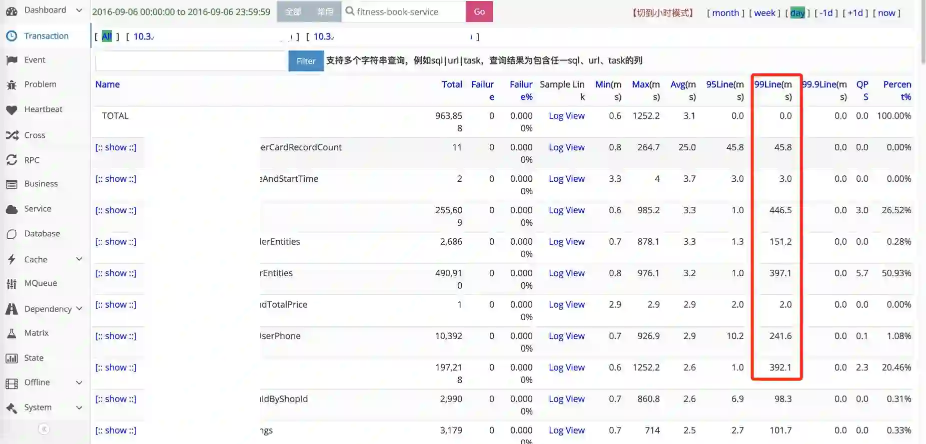 99line的监控数据,有很多SQL的返回时间超过100ms以上。