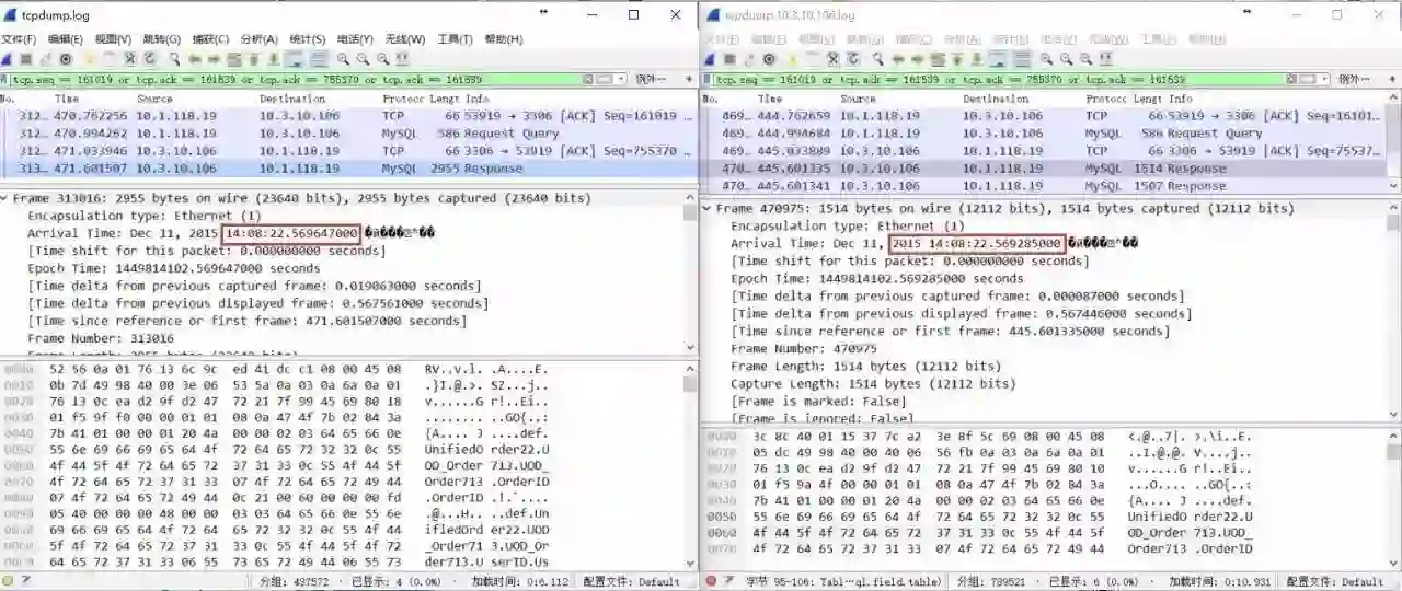 方法:分别在APP Server与MySQL Server部署TcpDump抓包工具,得到数据包在4个监测点的“到达时间”。为了方便,把如下4个Wireshark分析结果(对TcpDump抓取日志分析)按4个方位标注: