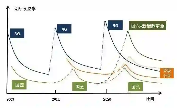 这里主要考察技术标准升级对经济增长的作用。5G通讯技术标准的提升,可以大幅度地推动边际收益递减曲线右移。技术创新增长的逻辑如图——3G、4G和5G通信技术边际收益率曲线图。