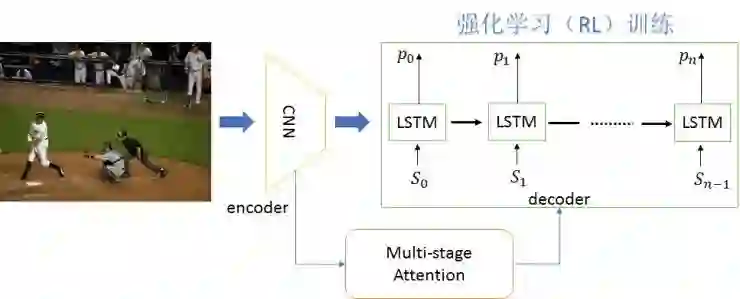 最近,腾讯 AI Lab 研发了新的强化学习算法(Reinforcement Learning)以进一步提高图像描述生成的模型能力,如上图所示。相应的图像描述生成模型,采用了编码器-解码器(encoder-decoder)[1] 的框架,同时引入了注意力(attention)的机制 [3]。基于之前研究的空间和通道注意力模型(spatial and channel-wise attention)[10] 的研究成果, AI Lab 构建了新网络模型引入了一个多阶段的注意力机制(Multi-stage Attention)。编码器,使用已有的图像卷积神经网络(CNN)如 VGG,Inception,ResNet 等,将给定的图像编码成为蕴含图像语义信息的向量。