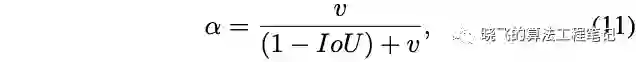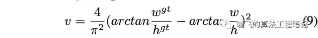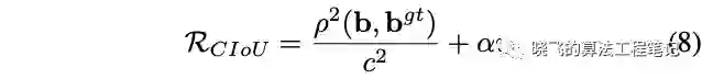 论文考虑到bbox回归三要素中的长宽比还没被考虑到计算中,因此,进一步在DIoU的基础上提出了CIoU。其惩罚项如公式8,其中 是权重函数,而 用来度量长宽比的相似性