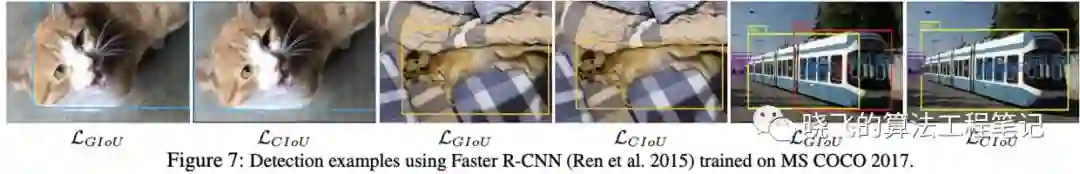 图7对GIoU和CIoU的结果进行了可视化,可以看到,在中大型物体检测上,CIoU的结果比GIoU要准确