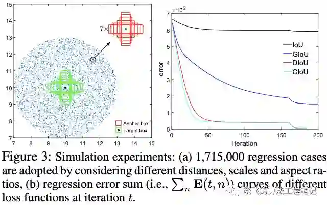 为了全面地分析IoU loss和GIoU的性能,论文进行了模拟实验,模拟不同的距离、尺寸和长宽比的bbox的回归情况
