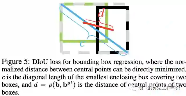 论文提出了能减少两个box中心点间的距离的惩罚项, 和 分别表示 和 的中心点。 是欧氏距离, 是最小包围两个bbox的框的对角线长度