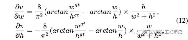 最后,CIoU loss的梯度类似于DIoU loss,但还要考虑 的梯度。在长宽在 的情况下, 的值通常很小,会导致梯度爆炸,因此在实现时将 替换成1