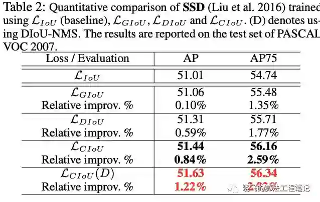 论文提出了两种新的IoU-based损失函数,DIoU loss和CIoU loss:DIoU loss最小化bbox间的中心点距离,从而使得函数快速收敛;CIoU loss则在DIoU loss的基础上加入长宽比的考量,能够进一步地快速收敛和提升性能。另外论文提出DIoU-NMS来代替原生的NMS,充分地利用IoU的特性进行优化,从实验结果来看,效果也是很好的