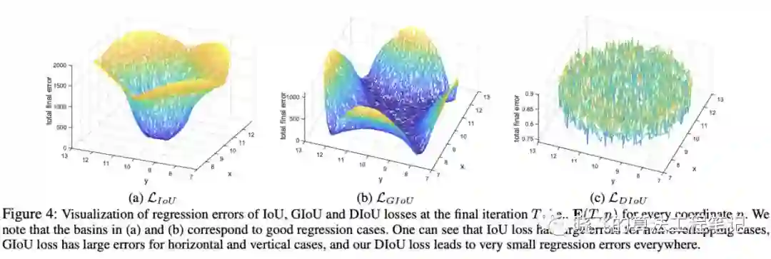 论文将5000个中心点上的bbox在最后阶段的total error进行了可视化。IoU loss只对与target box有交集的bbox有效,因为无交集的bbox的 为0。而GIoU由于增加了惩罚函数,盆地区域明显增大,但是垂直和水平的区域依然保持着高错误率,这是由于GIoU的惩罚项经常很小甚至为0,导致训练需要更多的迭代来收敛