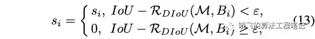 其中 是分类置信度, 为NMS阈值, 为最高置信度的框。DIoU-NMS倾向于中心点距离较远的box存在不同的对象,而且仅需改几行代码,DIoU-NMS就能够很简单地集成到目标检测算法中