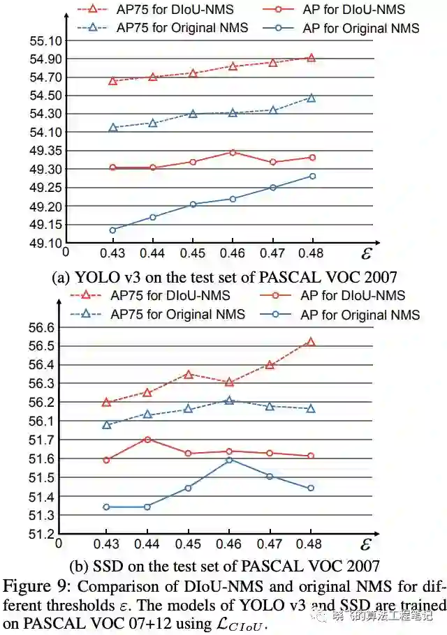 为了进一步验证DIoU-NMS的效果,进行了对比实验。如图9所示,DIoU-NMS的整体性能都比原生的NMS效果要好