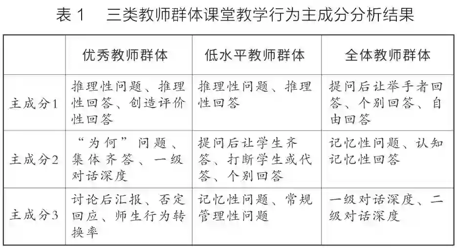 我们运用主成分分析法,将优秀教师群体、低水平教师群体和全体教师群体的课堂教学行为大数据进行了分析(见表1)。