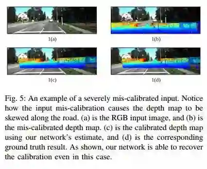 图5 严重误校准输入的示例。注意输入误校准是如何导致深度图沿着道路倾斜的。(a)是RGB输入图像,(b)是误校准的深度图。(c)是使用我们网络估计的校准深度图,(d)是相应的地面实况结果。如图所示,即使在这种情况下,我们的网络也能够恢复校准。