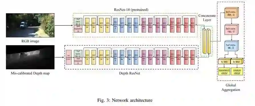 3D激光雷达和2D相机越来越多地在传感器装置并行使用来完成感知任务。然而,在用这些传感器进行数据采集之前需要精确校准它们的外部参数(和内部参数),原因是传感器的性能对这些校准参数非常敏感。绝大多数现有的校准技术需要大量的数据和/或校准目标以及人力,严重影响它们在大规模生产系统中的适用性。因此,本文采用CalibNet(一种几何监督的深度网络)解决了这个问题,CalibNet能够实时自动估算3D激光雷达和2D摄像机之间的6自由度刚体转换。CalibNet减少了对校准目标的需求,从而大大节省了校准工作量。在训练期间,网络仅将激光雷达点云,相应的单目图像和摄像机校准矩阵K作为输入。在训练时,我们不进行直接监督(例如我们不直接回归校准参数)。相反,我们训练网络预测校准参数,从而最大化输入图像和点云的几何和光度一致性。CalibNet能够迭代地解决基础几何问题,并准确地预测外部校准参数,以进行各种误校准,而无需重新训练或域适应。工程代码发布在:https://epiception.github.io/CalibNet
