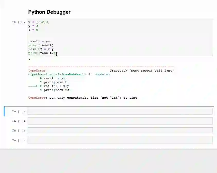 交互式调试器也是一个神奇的功能,我把它单独定义了一类。如果在运行代码单元时出现异常,请在新行中键入%debug并运行它。 这将打开一个交互式调试环境,它能直接定位到发生异常的位置。还可以检查程序中分配的变量值,并在此处执行操作。退出调试器单击q即可。