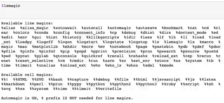Magic命令有两种:行magic命令(line magics),以单个%字符为前缀,在单行输入操作;单元magic命令(cell magics),以双%%字符为前缀,可以在多行输入操作。如果设置为1,则不用键入%即可调用Magic函数。