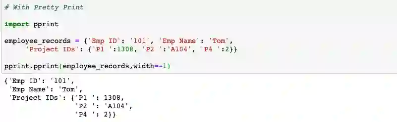 如果您想生成美观的数据结构,pprint是首选。它在打印字典数据或JSON数据时特别有用。接下来看一个使用print和pprint来显示输出的示例。