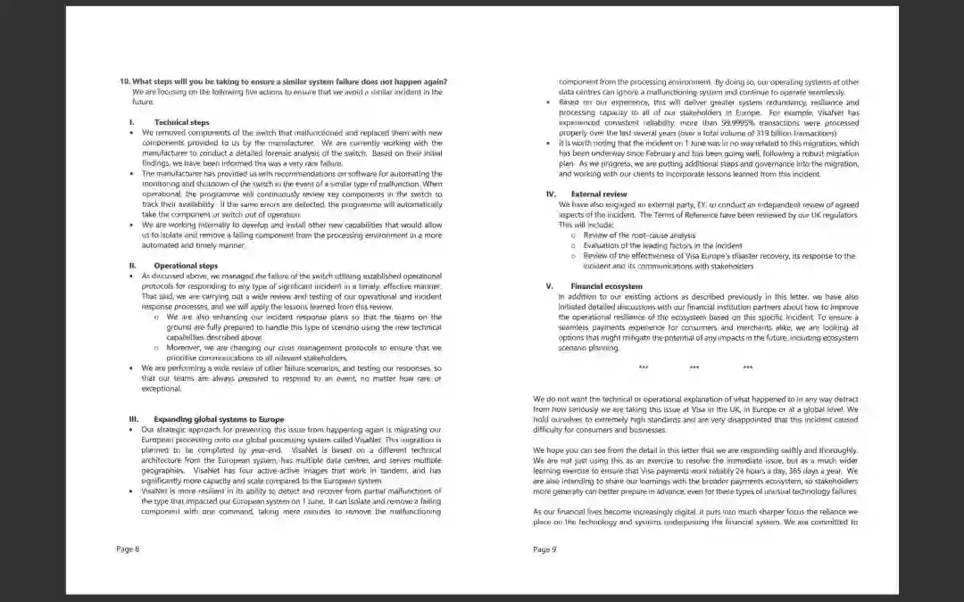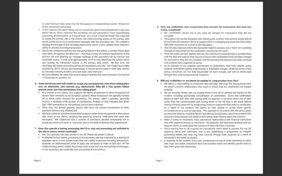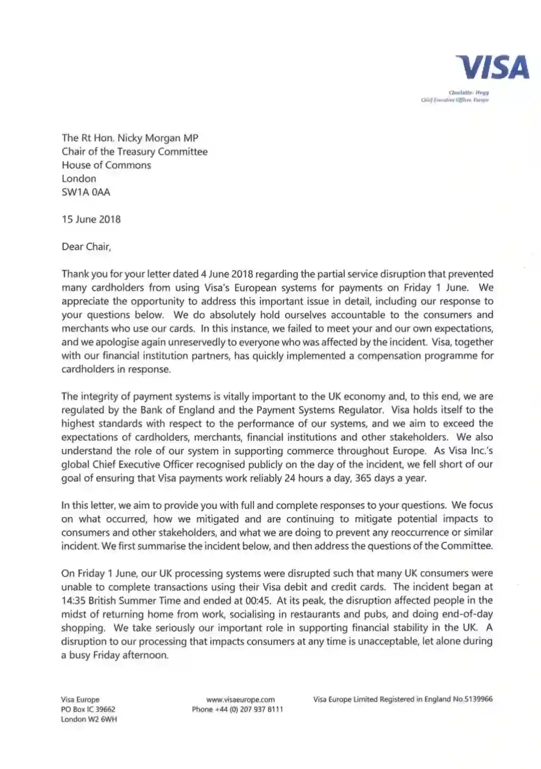 维萨欧洲首席执行官夏洛特•霍格(Charlotte Hogg)在上周晚些时候致英国财政委员会的信函(见文末)中解释了这个错误,并就这起故障发表了“坦诚的”道歉。英国财政委员会之前要求该公司就此事作出解释。