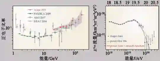 图3 宇宙线最新结果(a)PAMELA和Fermi卫星能谱仪测到的正电子比率在10—200GeV 能区令人惊讶地持续上升;(b)由PierreAuger观测站测量到的1018eV 能量以上宇宙线能谱,在3暳1019eV附近的陡降可能是预计的Greisen-Zatsepin-Kuzmin(GZK)截断.曲线和直线是对数据的不同拟合