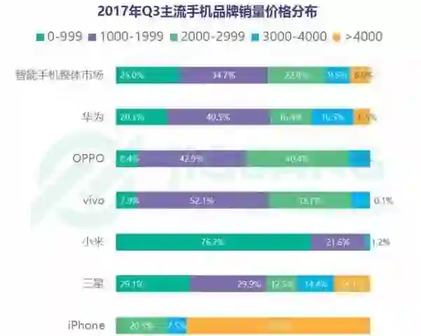两者售价的不同,核心的原因是两者的市场和用户的定位。小米定位则是高性价比,主打物美价廉,所以即使是高端的小米MIX系列、note 系列也会比竞争对手更具价格优势。另外,小米手机用户都是一些追求性价比的人,小米手机在第三季度有76.7%都是一千元以下的手机,而华为这一比例只有20.1%: