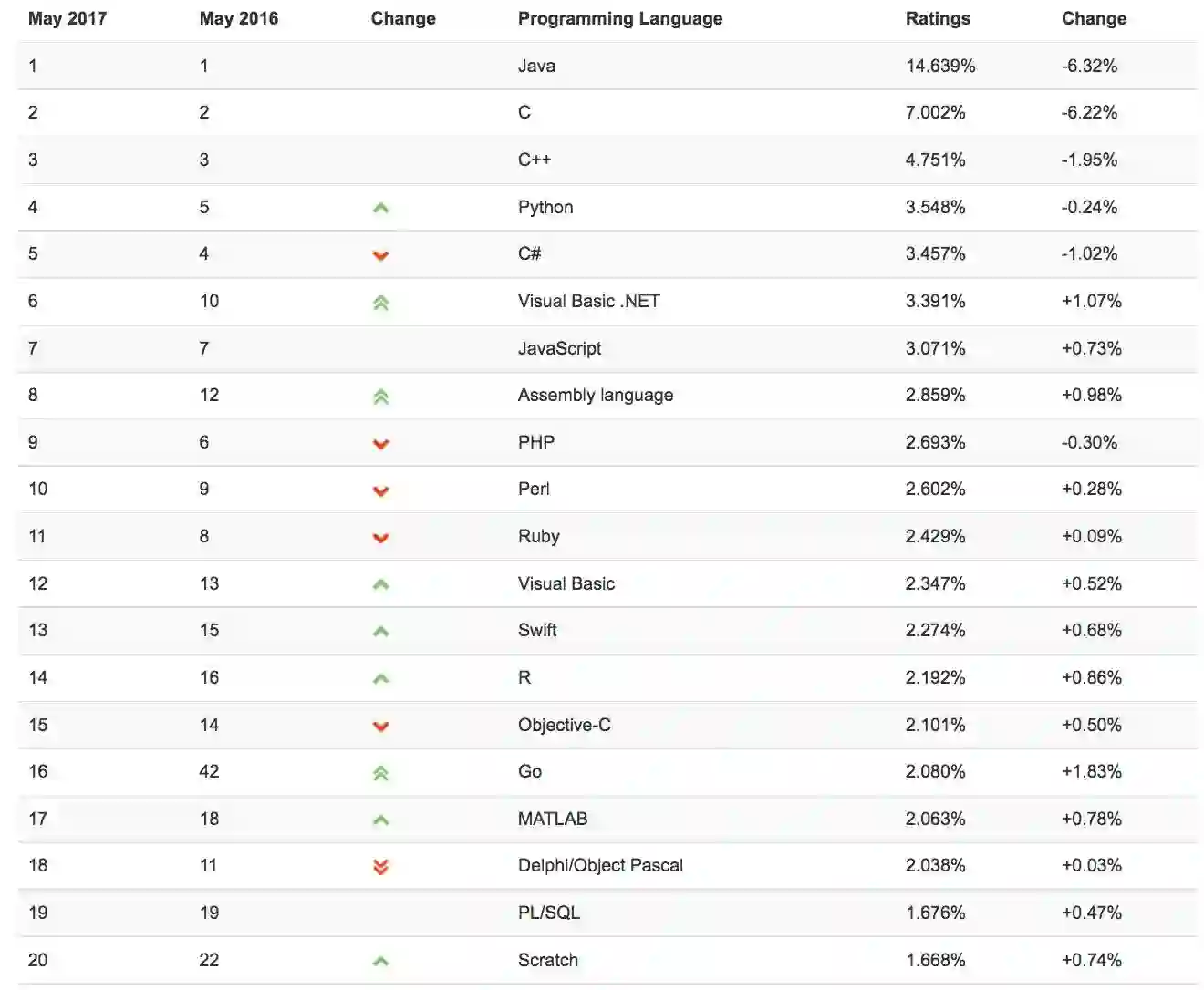 TIOBE 公布了5月编程语言排名,下图是进入前20名的