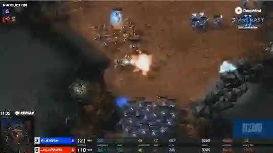 团队说,目前AlphaStar只用人类和人类的天梯比赛、以及AI与AI之间的比赛,作为训练数据。