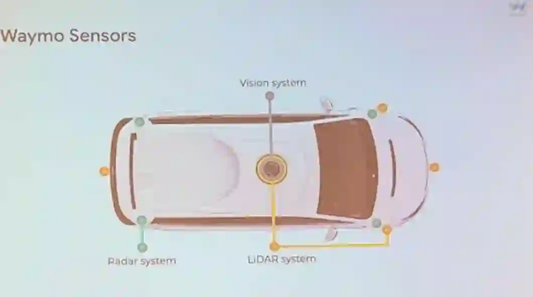 除了发布数据集,此次演讲也透露了 Waymo 的传感器配置,如下图所示,包括视觉系统、激光雷达系统和雷达系统。