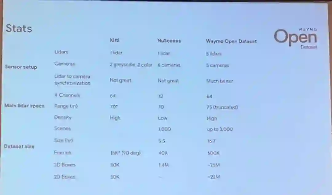 因此,在 CVPR 2019 现场,Waymo 首席科学家 Drago Anguelov 发布了包含完整传感器信息的全新标注数据集 Waymo Open Dataset,它与 KITTI、NuScenes 等数据集的对比数据如下,在传感器配置、数据集大小上都有很大的提升。