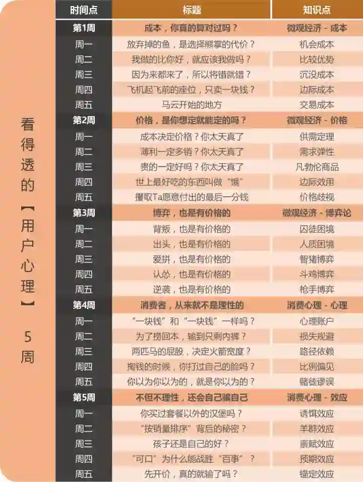 当你累死累活地做产品用户却不买账的时候,当你把价格降到成本价用户却买了同款更贵产品的时候,当你想把梳子卖给和尚的时候。请看第16课至第25课,带你了解消费心理。