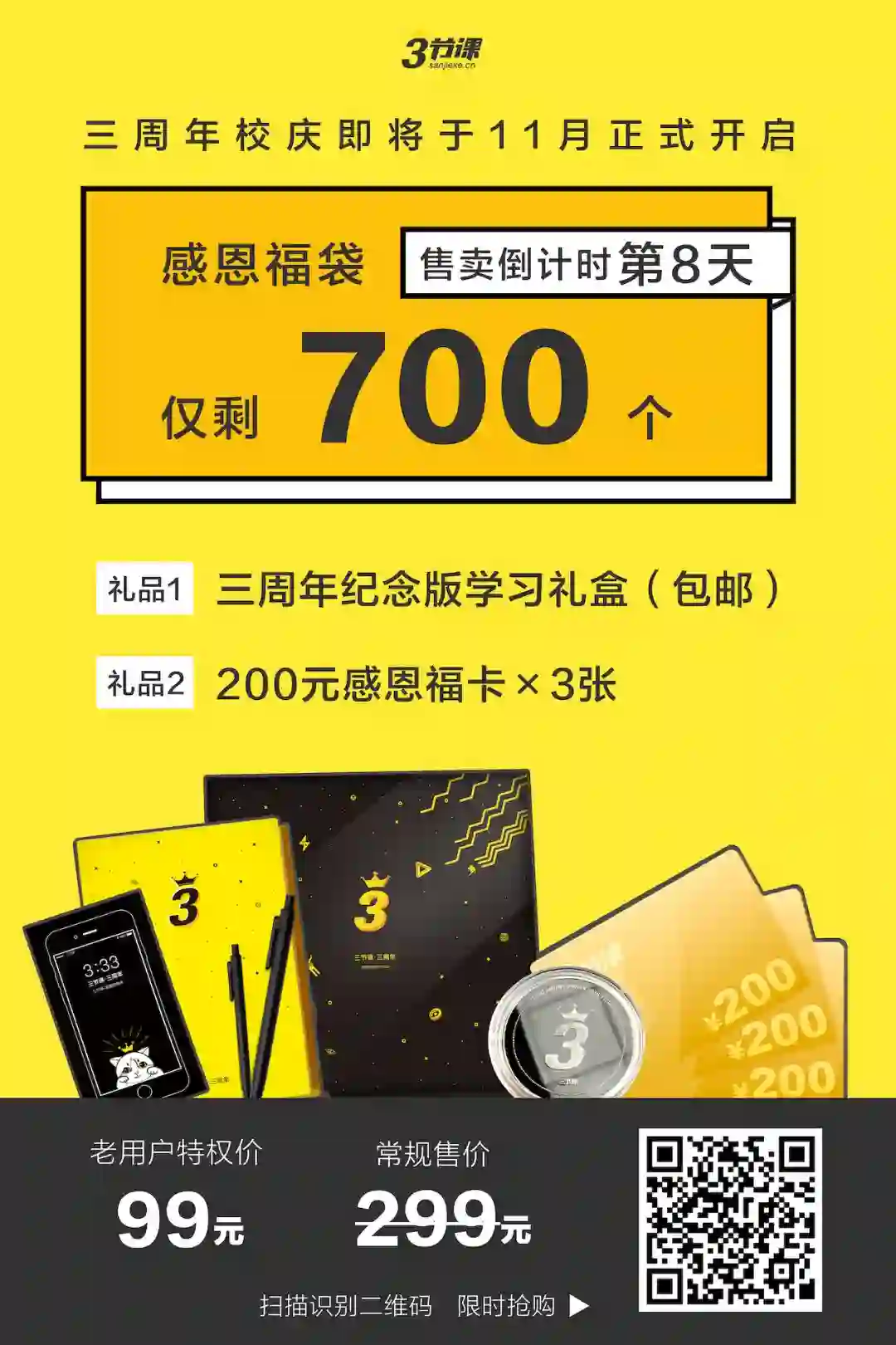 是的,11月即将迎来三节课3周年校庆,为了感谢一路支持和陪伴我们走来的同学们,我们限量定制了3333个感恩福袋:内含3张200元感恩福卡+价值199元的三周年纪念版礼盒。