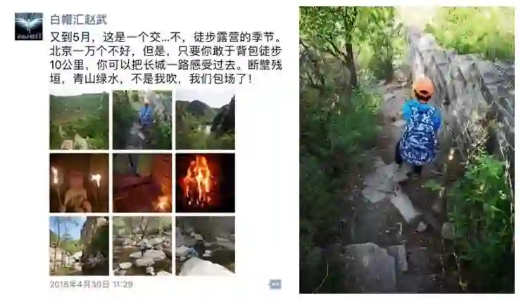 ▲赵武的朋友圈截图,他发布了很多张带小孩去野外的照片,他镜头里戴着帽子的小小孩也许也是“他自己”吧