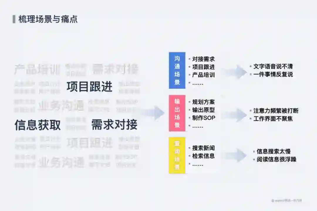 知道自己的工作场景后,再深入思考这个场景是否有反复遇到的问题,比如自己在以下场景分别存在的痛点
