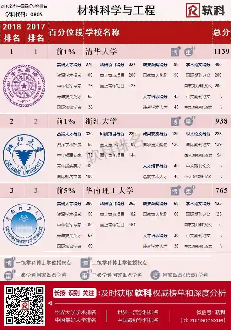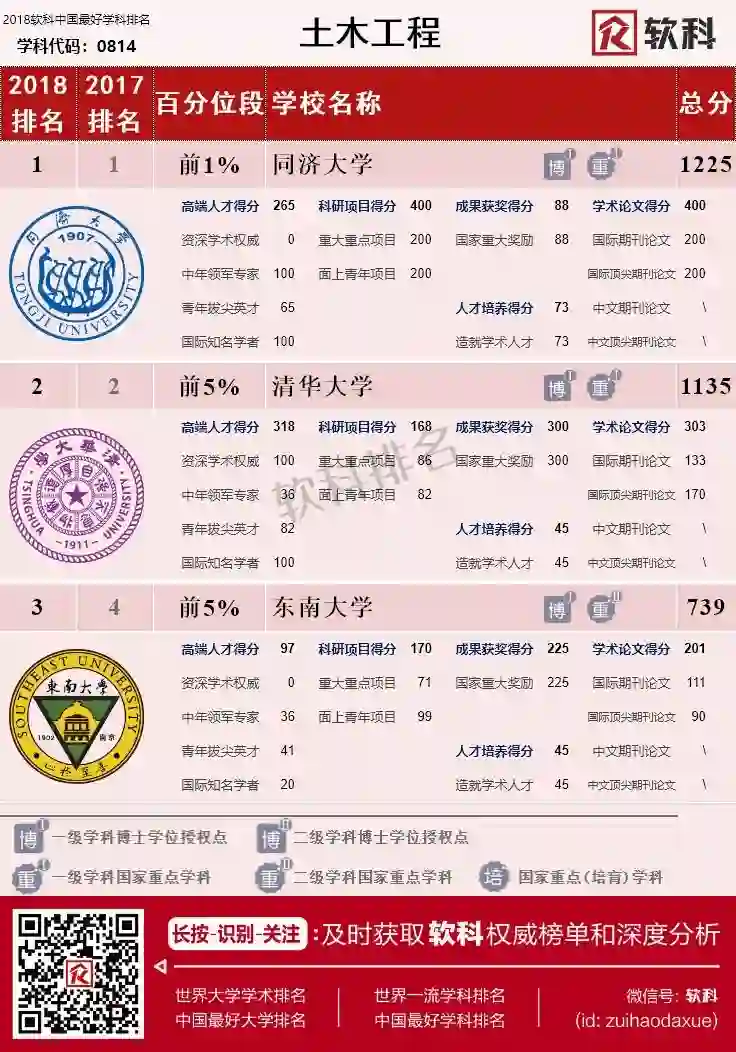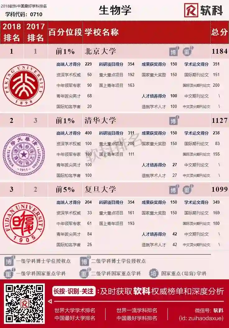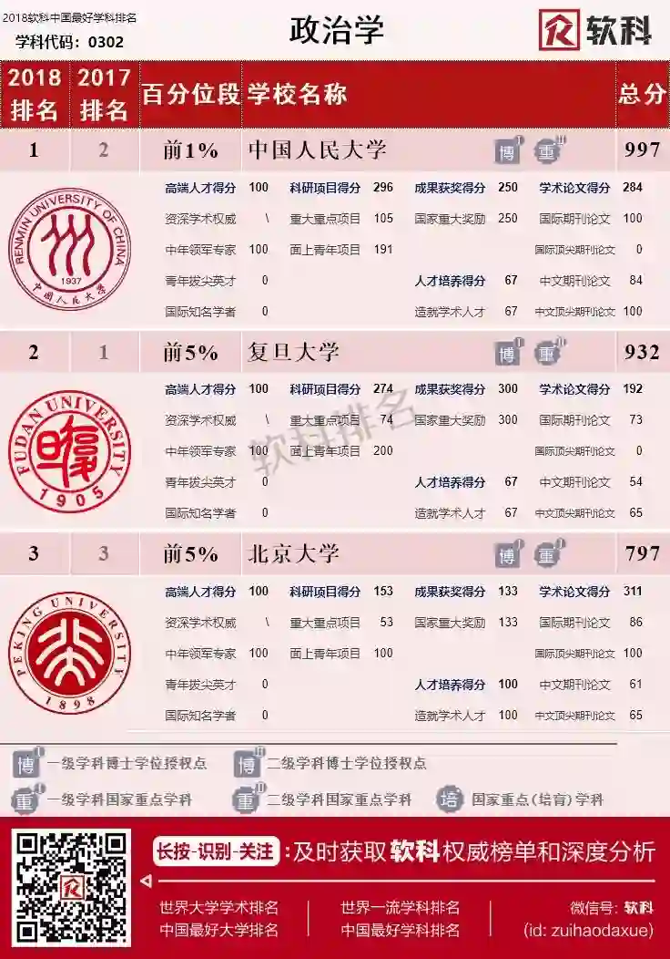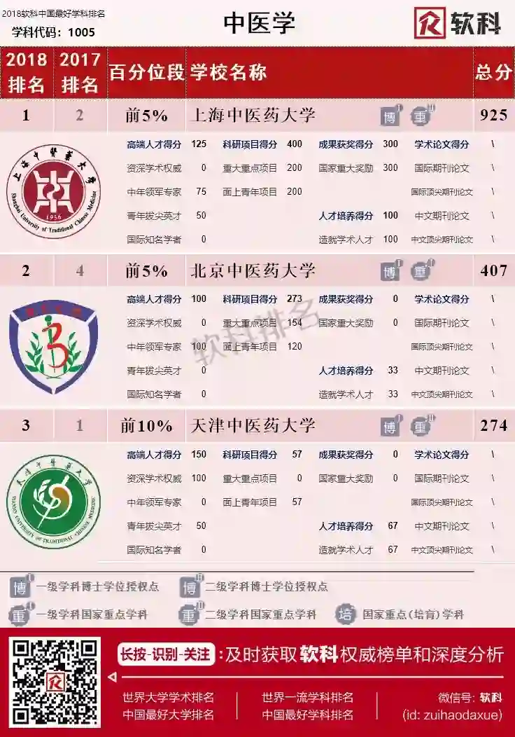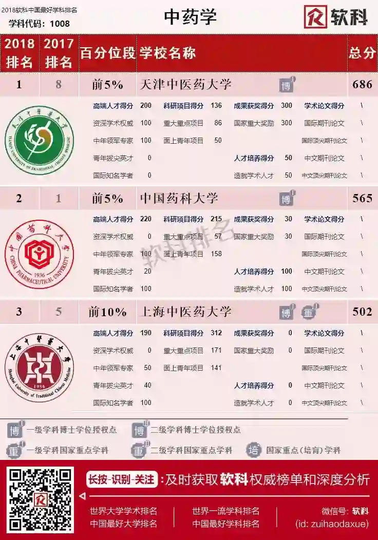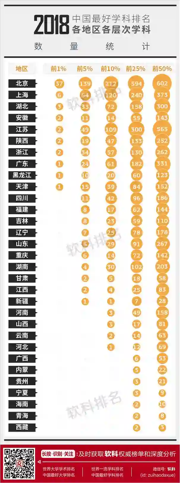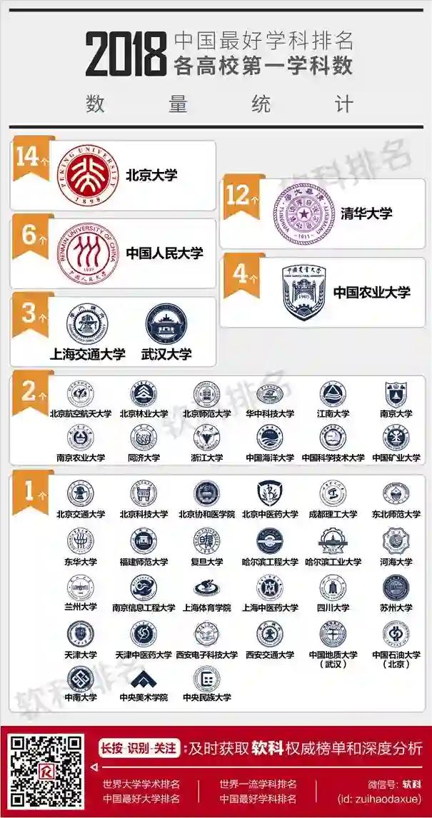 获取完整排名结果、排名方法、指标数据等更多信息,请关注微信公众号“软科”或访问软科旗下最好大学网(www.zuihaodaxue.com)。下载2018中国最好学科排名完整榜单,请长按识别下方二维码并关注微信公众号“软科”后,回复“2018BCSR”即可。