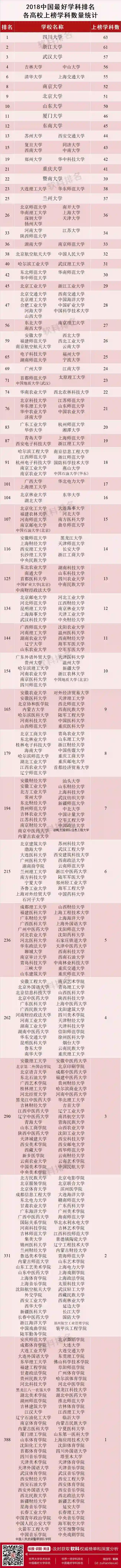 在中国最好学科排名中,各个学科排名的对象是在该一级学科设有学术型研究生学位授权点的所有高校,发布的是在该学科排名前50%的高校。按照上榜次数统计,四川大学有63个学科上榜,领先国内其它高校,浙江大学、武汉大学、吉林大学、中山大学、清华大学、上海交通大学、南京大学、北京大学、山东大学的上榜学科数也都达到或超过50个。