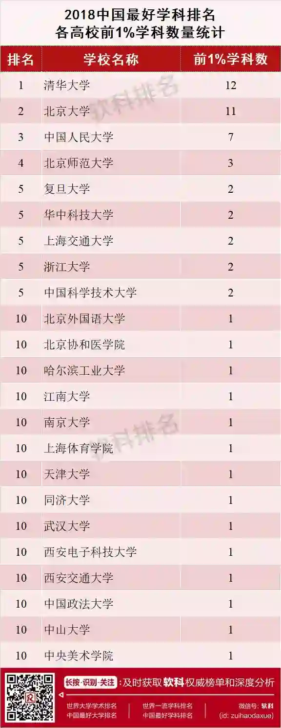 根据统计,共有23所大学的57个学科点入选全国前1%学科。清华大学以12个全国前1%学科成为各校之首。北京大学有11个前1%学科,比2017年多了3个,紧跟其后。中国人民大学有7个,名列第三。北京师范大学有3个学科点入选前1%学科,排在第四。复旦大学、华中科技大学、上海交通大学、浙江大学和中国科学技术大学各有2个学科点成为全国前1%,表现出众。